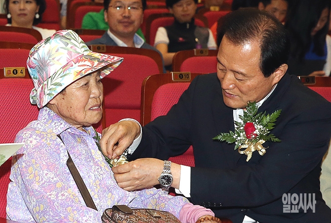 16일 오후 서울 여의도 국회 의원회관에서 노철래 의원실 주최로 열린 뮤지컬 '꽃신' 제작보고회에서 새누리당 노 의원이 이옥선 할머니에게 꽃을 달아주고 있다.