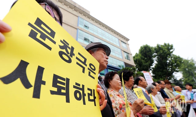 17일 서울 종로구 정부서울청사 창성동 별관 앞에서 민주노총을 비롯한 시민사회단체들이 '친일망언 문창극 국무총리 지명 철회 촉구 기자회견'을 갖고 있다.