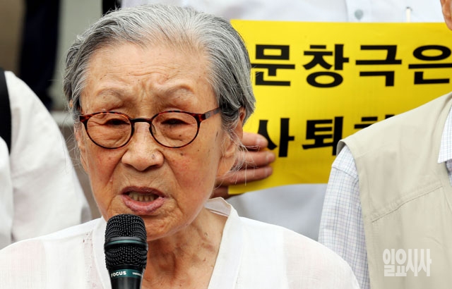 17일 서울 종로구 정부서울청사 창성동 별관 앞에서 열린 '친일망언 문창극 국무총리 지명 철회 촉구 시민사회단체 기자회견'에서 위안부 피해자 김복동 할머니가 발언을 하고 있다.