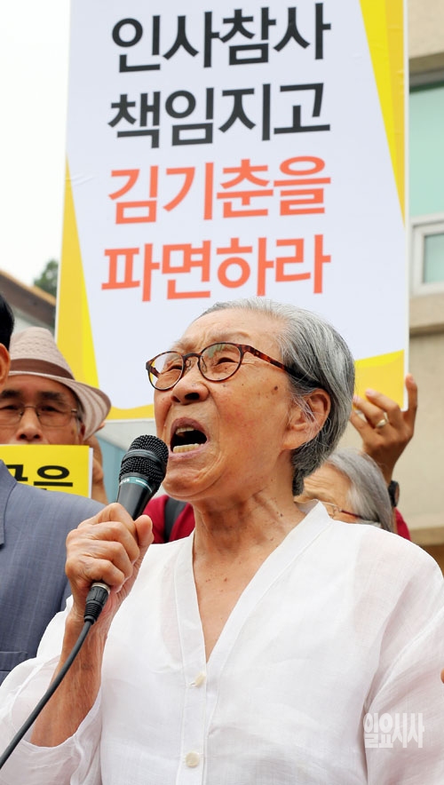 17일 서울 종로구 정부서울청사 창성동 별관 앞에서 열린 '친일망언 문창극 국무총리 지명 철회 촉구 시민사회단체 기자회견'에서 위안부 피해자 김복동 할머니가 발언을 하고 있다.