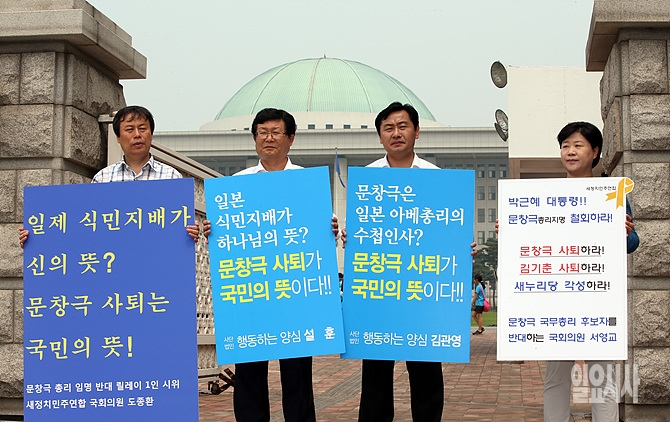 17일 오전, 새정치민주연합 도종환·설훈·김관영 의원 등이 문창극 총리 후보자의 거취와 관련해 서울 여의도 국회 정문 앞에서 피켓시위를 벌이고 있다.
