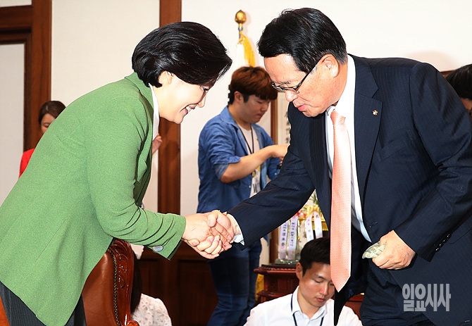 17일, 서울 여의도 국회 정의화 국회의장 집무실에서 열린 여야 면담 직전, 정 의장과 새정치민주연합 박영선 원내대표가 웃으며 인사를 나누고 있다.
