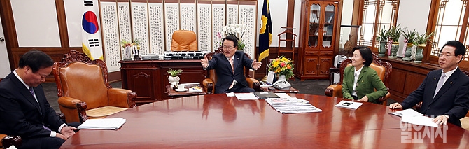 17일, 서울 여의도 국회 정의화 국회의장 집무실에서 열린 여야 면담에서 정 의장(사진 가운데)과 새정치민주연합 박영선 원내대표(사진 오른쪽에서 두 번째)가 웃고 있는 가운데, 새누리당 김재원 원내수석부대표가 고개를 숙이며 애꿎은 핸드폰만 보고 있다.