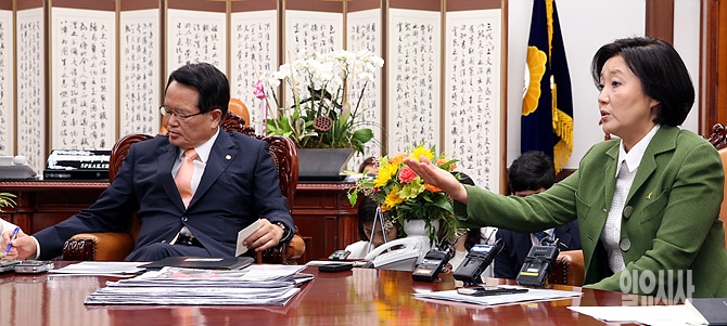 17일, 서울 여의도 국회 정의화 국회의장 집무실에서 열린 여야 면담에서 새정치민주연합 박영선 원내대표가 원 구성 등과 관련해 발언하고 있다.