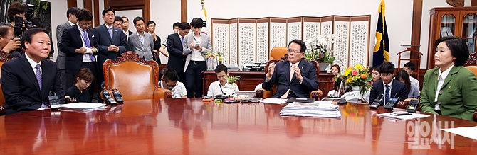 17일, 서울 여의도 국회 정의화 국회의장 집무실에서 열린 여야 면담에서 정 의장이 새정치민주연합 박영선 원내대표와 새누리당 김재원 원내수석부대표에게 발언하고 있다.
