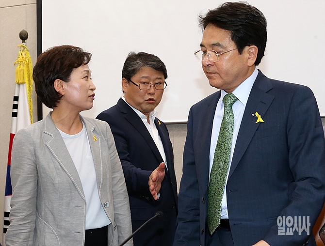 서울 여의도 국회에서 17일 오후 열린 세월호침몰사고 진상규명을 위한 국정조사특별위원회 전체회의에서 조원진 여당 간사(맨 왼쪽)와 김현미 야당 간사가 기관보고 등과 관련해 심재철 위원장(맨 오른쪽)과 대화를 하고 있다.