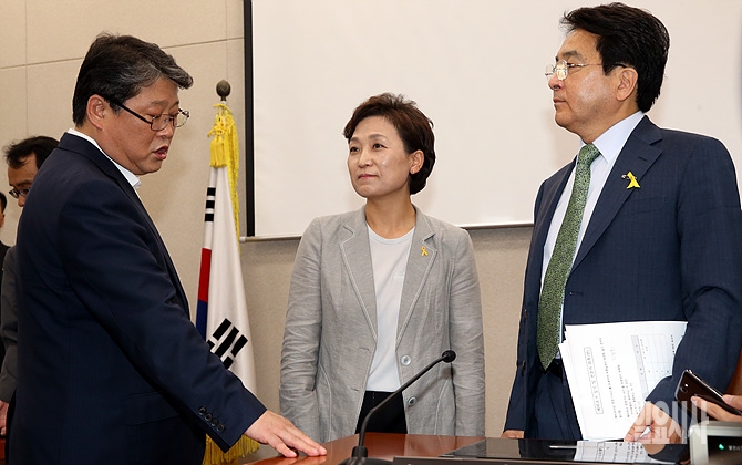 17일 오후, 서울 여의도 국회에서 열린 세월호특위 도중 조원진 여당 간사와 김현미 야당 간사가 심재철 특위위원장과 이야기를 나누고 있다.