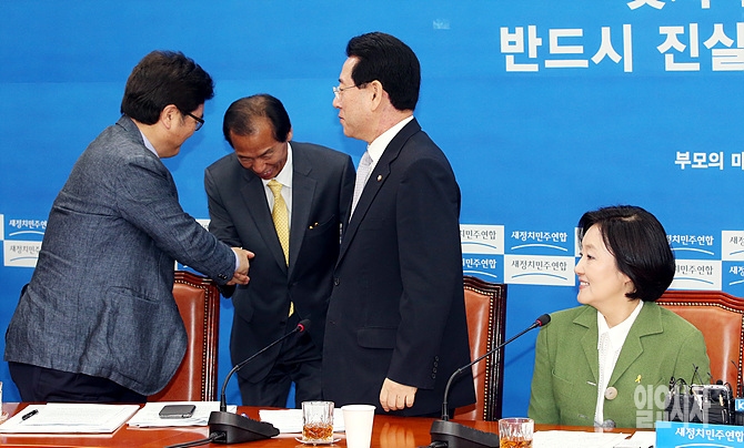 17일, 최문순 강원도지사 당선인이 서울 여의도 국회에서 열린 새정치민주연합 원내대책회의에 참석해 우원식 최고위원과 악수를 나누고 있다.
