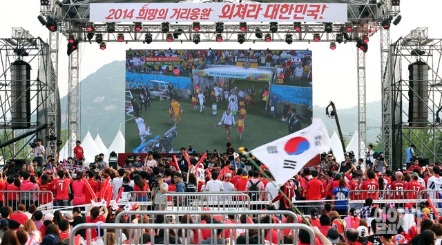 2014 브라질 월드컵 조별리그 H조 대한민국과 러시아의 경기가 열린 18일 서울 광화문광장에 모인 붉은악마 및 시민들이 경기를 보며 응원을 펼치고 있다.