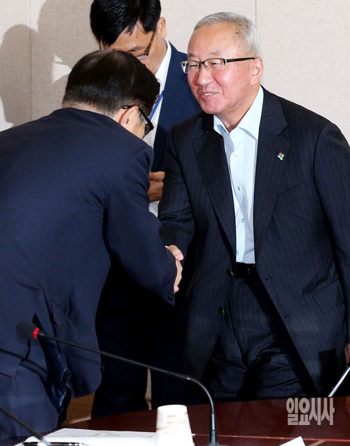 현오석 부총리 겸 기획재정부 장관이 18일 서울 도렴동 정부서울청사 별관에서 열린 제10차 공공기관 운영위원회에서 참석자들과 인사하고 있다.
