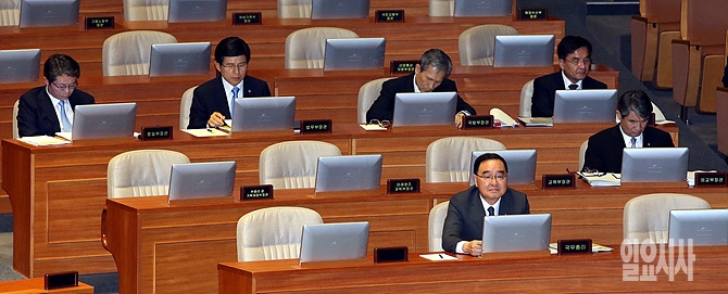 18일, 서울 여의도 국회 본회의장에서 열린 외교·안보 부문 국회 대정부 질문에서 정홍원 국무총리 및 국무위원들이 자신의 차례를 대기하고 있다.