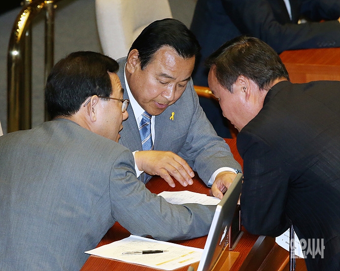 18일, 서울 여의도 국회 본회의장에서 열린 외교·안보 부문 국회 대정부 질문에 앞서 이완구 새누리당 원내대표-주호영 정책위의장-김재원 원내수석부대표가 이야기를 나누고 있다.