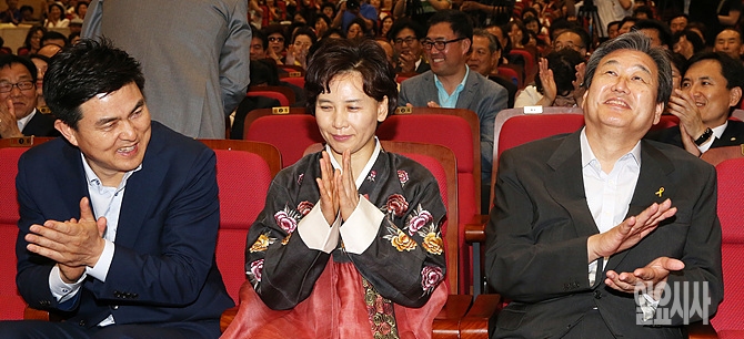 18일, 새누리당 7·14전당대회 출마를 선언한 김무성 의원이 서울 여의도 국회에서 열린 김태호 의원(사진 왼쪽)의 출판기념회에 참석해 웃으면서 박수를 치고 있다.