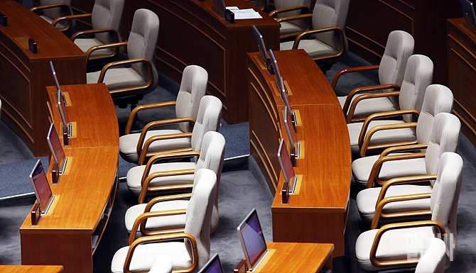 18일, 서울 여의도 국회에서 열린 국회 대정부질문 정치·안보 부문이 열린 가운데, 대부분의 의원석이 텅텅 비어 있다.