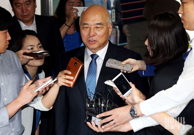 문창극 국무총리 후보자가 19일 서울 종로구 정부서울청사 창성동 별관으로 출근하며 취재진의 질문에 답하고 있다.