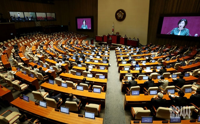 심상정 정의당 원내대표가 19일 서울 여의도 국회에서 열린 본회의에서 비교섭단체 대표연설을 하고 있다.