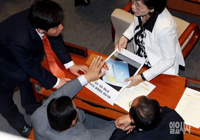 이완구 새누리당 원내대표를 비롯한 동료의원들이 19일 서울 여의도 국회에서 열린 본회의에서 '새누리당 의원총회 보고서 한겨레 보도 사진'을 놓고 이야기를 나누고 있다.