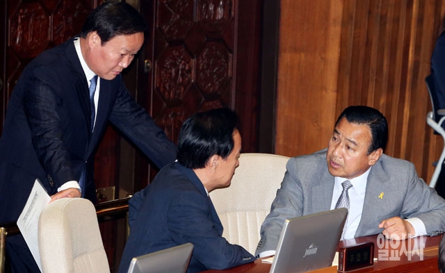 이완구 새누리당 원내대표(오른쪽)와 김재원 원내수석부대표(위쪽), 이병석 의원이 19일 서울 여의도 국회에서 열린 본회의에서 이야기를 나누고 있다.