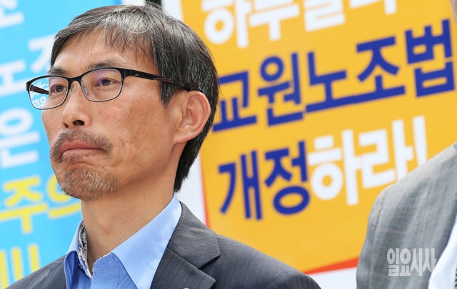 김정훈 전국교직원노동조합 위원장이 19일 서울 양재동 서울행정법원에서 열린 법외노조통보처분취소 소송 1심 판결에서 패소한 뒤 법원 앞에서 기자회견을 갖고 있다.