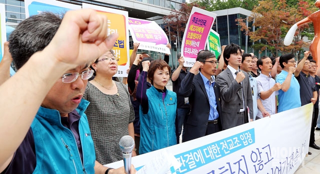 김정훈 전국교직원노동조합 위원장을 비롯한 조합원들이 19일 서울 양재동 서울행정법원에서 열린 법외노조통보처분취소 소송 1심 판결에서 패소한 뒤 법원 앞에서 기자회견을 갖고 있다.