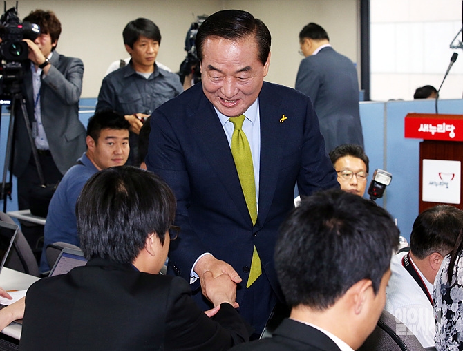 19일, 서울 여의도 새누리당 당사에서 친박(친 박근혜)계 맏형으로 통하는 서청원 의원이 당 대표를 선출하는 7·14전당대회 출마 공식선언 기자회견 직후 한 취재진과 악수를 나누고 있다.