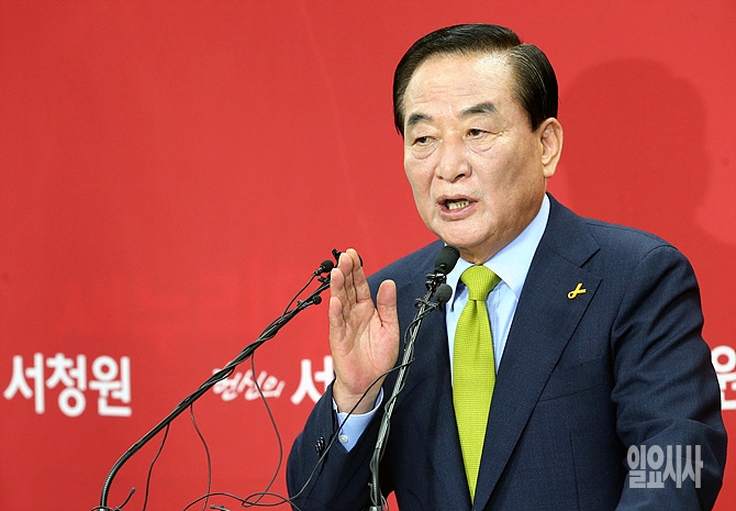 19일, 서울 여의도 새누리당 당사에서 친박(친 박근혜)계 맏형으로 통하는 서청원 의원이 기자회견을 열고 당 대표를 선출하는 7·14전당대회 출마를 공식선언하고 있다.