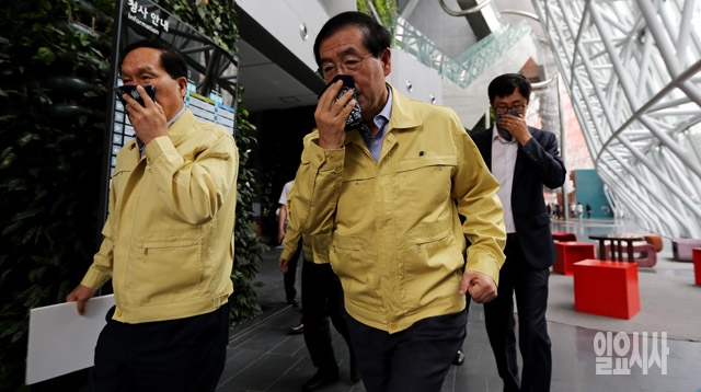 제394차 민방위훈련이 실시된 20일 서울시청에서 박원순 서울시장이 화재대피 훈련을 하고 있다.