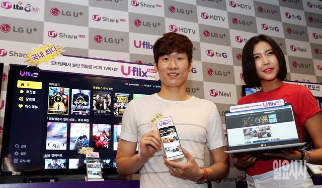 LG유플러스가 LTE 상용화 서비스 3년을 맞아 23일 서울 광화문 세종문화회관에서 광대역 LTE-A '비디오 LTE' 공개행사를 갖고 있다. 이날 자사 광고모델인 축구선수 박지성이 모델들과 서비스를 시연하고 있다.
