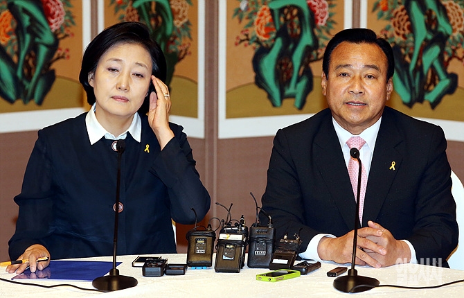 이완구 새누리당(사진 오른쪽), 박영선 새정치민주연합 원내대표가 23일 오전 서울 여의도 국회 사랑재 주례회동서 이 원내대표가 발언하고 있다.