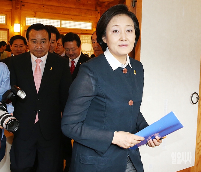 이완구 새누리당, 박영선 새정치민주연합 원내대표가 23일 오전 서울 여의도 국회 사랑재에서 주례회동을 마치고 사랑재를 나서고 있다.