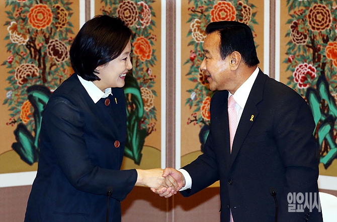 이완구 새누리당, 박영선 새정치민주연합 원내대표가 23일 오전 서울 여의도 국회 사랑재 주례회동에서 악수를 나누고 있다.