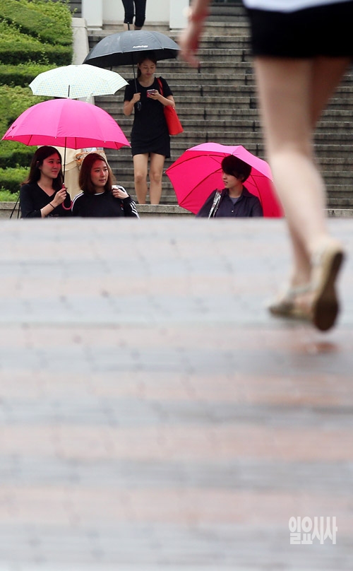 비가 내리는 23일 서울의 한 여자대학교 캠퍼스에 학생들이 우산을 쓰고 발걸음을 재촉하고 있다.