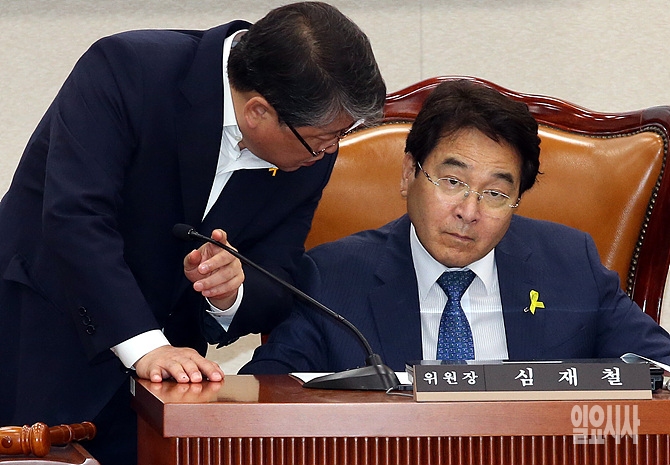 23일, 서울 여의도 국회에서 세월호침몰사고 진상규명을 위한 국정조사특별위원회 전체회의 도중, 새누리당 조원진 여당 간사와 심재철 위원장이 귓속말을 하고 있다.