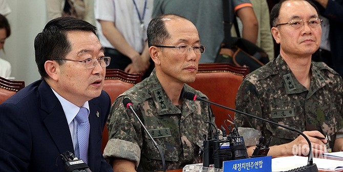 23일 서울 여의도 국회 새정치민주연합 원내대표실에서 강원 고성 GOP총기사고에 대한 논의 자리에서 백승주 차관(사진 왼쪽)이 군 관계자들이 참석한 가운데, 의원들에게 보고하고 있다.