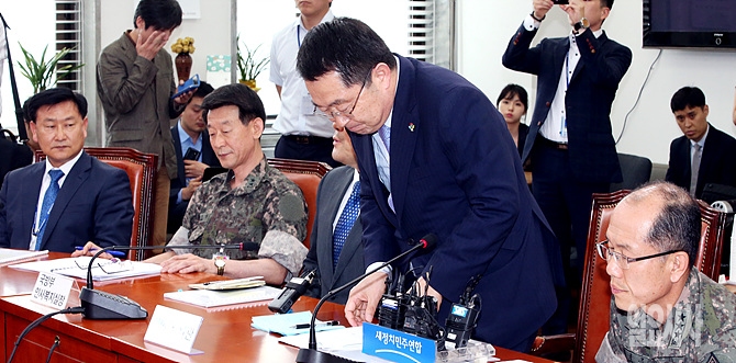 23일 서울 여의도 국회 새정치민주연합 원내대표실에서 열린 강원 고성 GOP총기사고 보고 직전, 백승주 차관이 의원들을 향해 인사를 하고 있다.