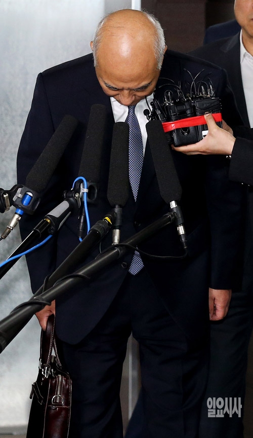 문창극 국무총리 후보자가 23일 서울 종로구 정부서울청사 창성동 별관에서 퇴근하며 허리 숙여 인사하고 있다.