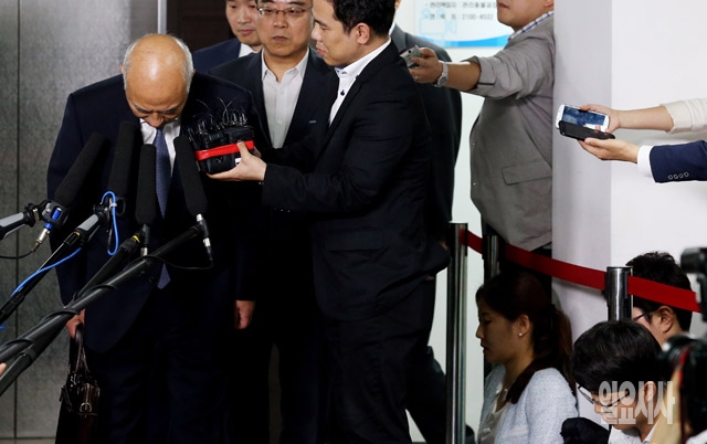문창극 국무총리 후보자가 23일 서울 종로구 정부서울청사 창성동 별관에서 퇴근하며 허리 숙여 인사하고 있다.