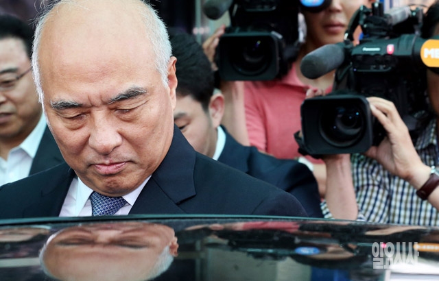 문창극 국무총리 후보자가 23일 서울 종로구 정부서울청사 창성동 별관에서 퇴근하고 있다.