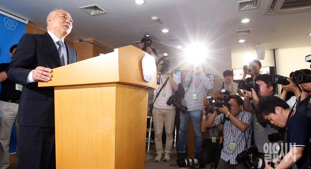 문창극 국무총리 후보자가 24일 서울 종로구 정부서울청사에서 긴급 기자회견을 갖고 자진 사퇴를 밝히고 있다.