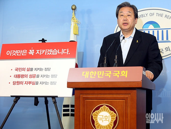 7·14전당대회 출마를 선언한 김무성 새누리당 의원이 24일 오전 서울 여의도 국회 정론관에서 전당대회 관련 기자회견에 앞서 '문창극 사퇴'와 관련해 발언하고 있다.
