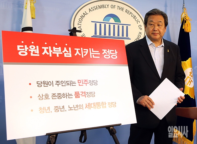 7·14전당대회 출마를 선언한 김무성 새누리당 의원이 24일 오전 서울 여의도 국회 정론관에서 전대 관련 기자회견을 갖고 있다.