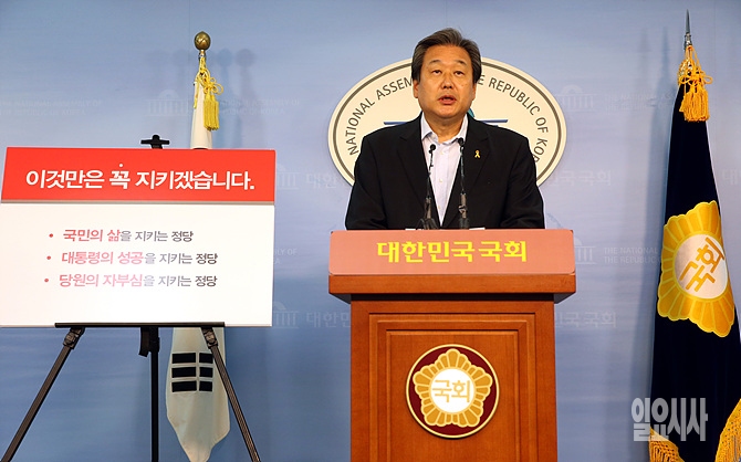 7·14전당대회 출마를 선언한 김무성 새누리당 의원이 24일 오전 서울 여의도 국회 정론관에서 전대 관련 기자회견을 갖고 있다.
