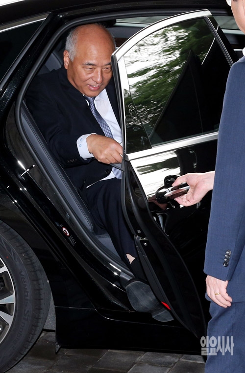 문창극 국무총리 후보자가 24일 서울 종로구 정부서울청사에서 긴급 기자회견을 갖기 위해 차량에서 내리고 있다.