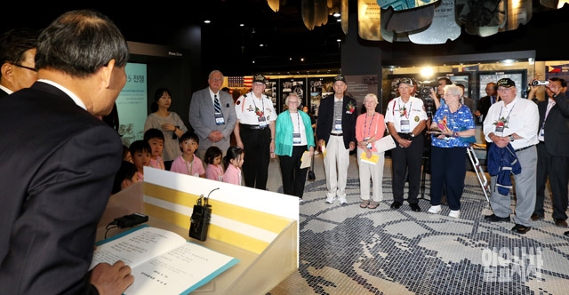 6.25 전쟁 64주년을 하루 앞둔 24일 서울 용산구 전쟁기념관에서 열린 UN군 참전용사 전쟁소장품 기증식에서 참전용사들이 박승춘 국가보훈처장의 발언을 경청하고 있다.
