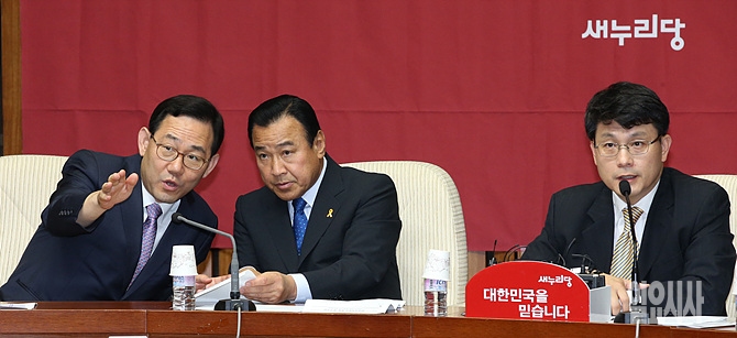 이완구 새누리당 원내대표(오른쪽)와 주호영 정책위의장이 24일 서울 여의도 국회에서 열린 원내대책회의 도중 대화를 나누고 있다.