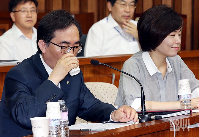 조태열 외교부 2차관이 24일, 서울 여의도 국회에서 열린 새누리당 원내대책회의 참석 도중 물을 들이키고 있다.