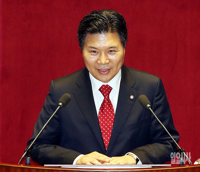 24일 오후, 서울 여의도 국회 본회의장에서 열린 본회의에서 국회 미래방송통신위원회 위원장으로 선출된 홍문종 의원(새누리당)이 당선인사를 하고 있다.