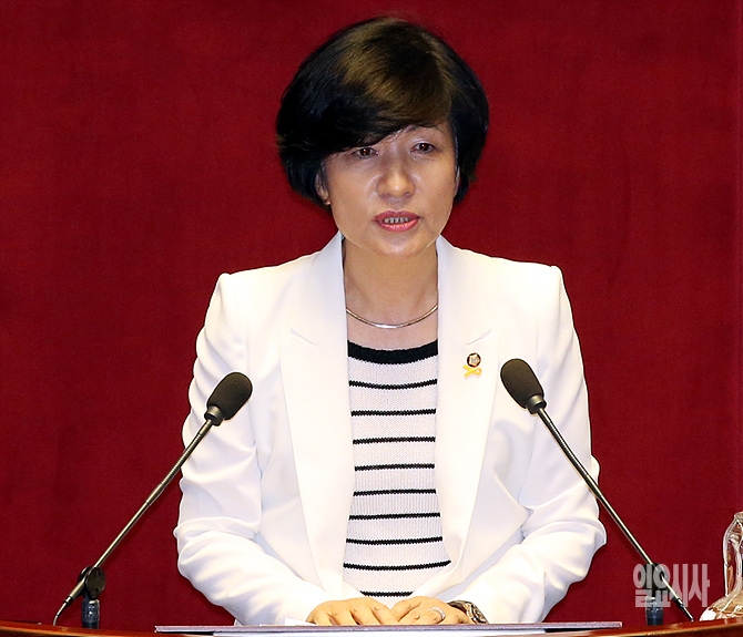 24일 오후, 서울 여의도 국회 본회의장에서 열린 본회의에서 국회 환경노동위원회 위원장으로 선출된 김영주 의원(새정치민주연합)이 당선인사를 하고 있다.