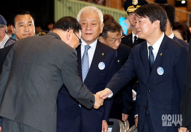 정홍원 국무총리(왼쪽)가 25일 서울 잠실실내체육관에서 열린 6ㆍ25전쟁 64주년 행사를 마친 뒤 안철수 새정치민주연합 공동대표와 악수하고 있다.
