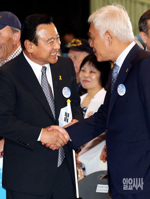 이완구 새누리당 원내대표(왼쪽)와 김한길 새정치민주연합 공동대표가 25일 서울 잠실실내체육관에서 열린 6ㆍ25전쟁 64주년 행사를 마친 뒤 악수하고 있다.